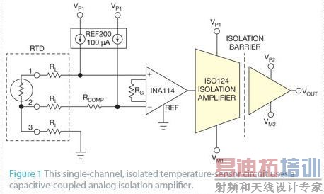 图1中的单通道隔离温度测量电路采用了一种电容耦合的模拟隔离放大器。在电路中,一只RTD(电阻温度探测器)将温度转换为一个电阻值。一个100-μA电流源将RTD电阻值转换为电压。INA114仪表放大器对RTD/100-μA电压做放大,并消除RTD接线电阻RL。仪表放大器的增益与隔离放大器的输入电压范围相匹配。