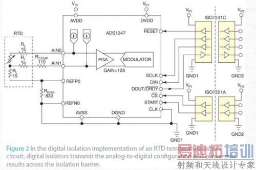 ISO7241和ISO7221数字隔离器通过隔离屏障,传送模数结构以及转换结果。图2中的隔离器采用了内部电容隔离技术,跨越隔离器传送数字信号,采用8脚和16脚封装。