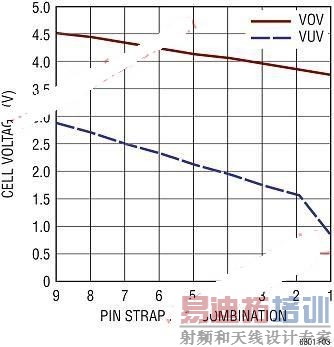 图 3 绘出的是可设定的过压和欠压门限范围。选择过压 (OV) 门限是为了使用具有3.3V 标称电压和 4.2V 告警电平的锂离子电池,而欠压 (UV) 门限对电池电量耗尽提供一个合理的指示。OV 和 UV 门限由不同的引脚设定,因此任何组合都有可能。OV 和 UV 电平必须设定,以在不是太接近正常电池电压时,就可指示某件事可能出错了,否则有可能引起故障检测电路出现讨厌的跳变。