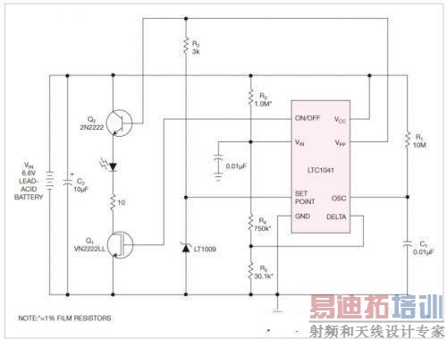 在控制器有效的80μs导通时间内,控制器的VPP输出切换为VCC ,而在关断期间则切换为高阻。一个快速安定基准设定了触发点。R2必须足够小,以为LT1009提供所需最小电流。R3、R4和R5对电池电压做分压,并送入一个比较器的输入端。电阻提供了5.5V的下触发点和5.95V的上触发点。内部比较器有低电流偏置点,从而能够为分压器使用大阻值电阻。R5设定了比较器的迟滞。比较器驱动一个内部RS触发器,当VINSETPOINT+DELTA时,触发器复位(ON/OFF=ground)。