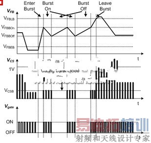VFBBoff 为3.0V,VFBBOn 为3.6V。该电压阈值远高于传统突发模式的阈值,可节省IC和反馈回路光电耦合器的能耗。由于其具备较高的电压电平,因此具备出色的抗噪性能。相对于突发模式,这种运行更加稳定,从而实现更高的能效。