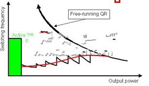 图注:Switching frequency: 开关频率;Active burst mode: 主动突发模式;Free-running QR: 自由运行QR;Output power: 输出功率