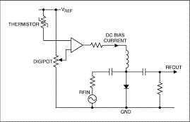 有些系统可能需要进行温度补偿(图3),简化电路中,数字电位器IC建立固定或可调偏置电平,热敏电阻提供温度输入。这两个输入连接到运算放大器,产生的输出通过一个电阻驱动PIN二极管。