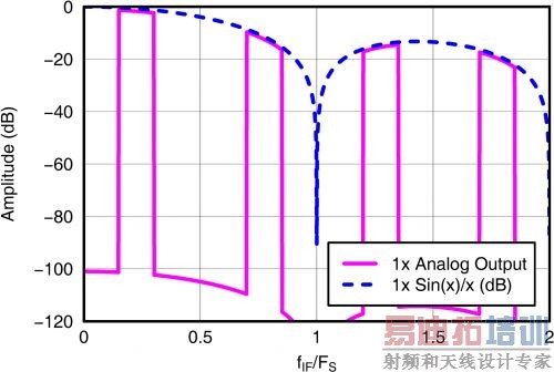 π*fIF/fs) 方程式 1 其中,fIF为模拟输出频率,而 fs为采样速率。这种响应具有低通效果(请参见图 2),其 f = fs/2 时的损耗为 ~ 3.5 dB,并在 fs倍数时为零。尽管 DAC 输出在 N*fs +/- fIF时会有信号图像,但较高奈奎斯特 (Nyquist) 区域的图像振幅远低于 fIF 处的信号,从而有更低的信噪比 (SNR),并可能出现明显的振幅下降。这便将大多数应用限制在 fs/2 以下的输出信号频率。另外,fIF处的信号和 fs – fIF图像之间的间隔,随着 fIF接近 fs/2 而减小,从而让 DAC 输出端的模拟滤波器(作用是去除 fs – fIF多余图像)难以建立,最终将大多数应用的 fIF限制在 fs/3 以下。