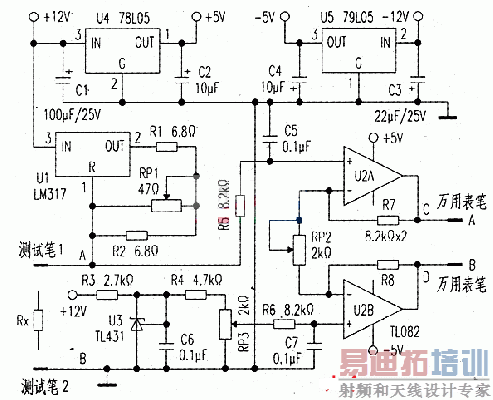 为了提高放大器的稳定度和精度,用u4和u5为运放提供对称的+5V工作电源。U3以及电阻R3构成2.5v参考电位电路,通过R4及精密电位器RP3给运放U2B的同相端施加合适的电位,用于抵消由于电流流经测试笔1和测试笔2引线以及接触电阻所产生的电压降。