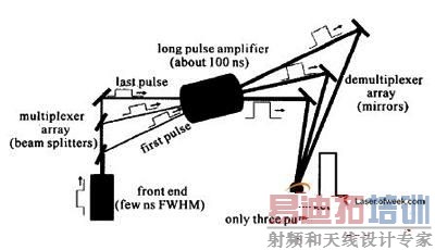 对于准分子激光放大器,由于激活介质的上能态储能时间很短,必须连续补充瞬态储能(Em)才能获得高能输出,即E=EmT/t,其中T是增益时间,t是增益恢复时间。对于电子束泵浦的准分子激光放大器,增益时间可以长达200ns,T/t≈100,这意味着对于单个要放大的短脉冲,只能提取出很小一部分能量。为了持续提取出放大器中的储能,通常使用光学多路编码技术 。
