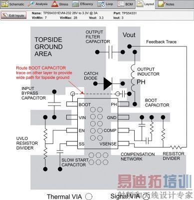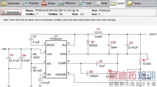 图1SwitcherPro 软件给出的TPS54331 布局 SwitcherPro 工具还为您提供了修改电路要求的机会,甚至可以修改示意图中的组件。通过复制 EVM 设计,然后选择编辑电路选项,便可以进行修改。这样一来,您就可以修改 DC/DC 转换器的输入最小值和最大值,也可以修改输出电压和电流要求。软件还具有一般分析、应力分析、效率分析和回路分析功能,方便您评估电路。 为了完成设计,您需要返回到您的评估模块,按照 SwitcherPro 的建议修改各项值,然后对您的新电路进行测试和验证。最后,如果您是在线工作,便可以轻松地同其它人分享您的设计。