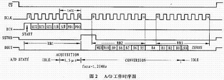 图2给出了这一过程的时序图。其中字节RB2、RB3包含了转换的结果,首位和属3位都为0。全部转换过程的时间主要由时钟的频率及二字节间的空闲时间来决定,为避免T/H的过多衰减,应保证其全部转换时间不超过120μs。