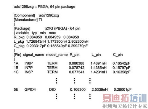 描述的那样,[Pin] 关键字与具体的封装有关。您会在[Pin]关键字表中找到封装电容和电感,因为它与引脚有关。例如,在ads129x.ibs模型中(《参考文献 2》),图 2 表明了在哪里可以找到引脚 5E(PBGA,64 引脚封装)信号 GPIO4 的 L_pin 值和 C_pin 值。
