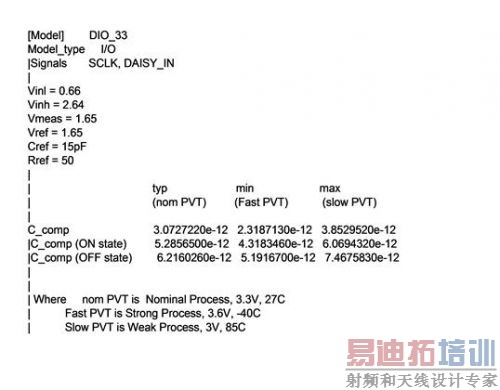 图 3 ads129x.ibs 中,其为 Model DIO_33 及其相关 C_comp 值的列表。 在图 3 的声明中,"|"符号表示一段注释。该声明中的有效 C_comp(《参考文献 3》)列表为: | typ min max| (nom PVT) (Fast PVT) (slow PVT)C_comp 3.0727220e-12 2.3187130e-12 3.8529520e-12 通过该列表,PCB 设计人员可以在三个值之中做出选择。在 PCB 传输线路设计阶段,3.072722 Pf 的典型值是正确的选择。 IBIS 模型为 PCB 设计人员提供了一些线索,让他们可以在转到样机设计以前进行板模拟。如果您知道了查找的方法,IBIS 模型就可以为您提供所有引脚的特性阻抗和电容。评估工作的下一步是确定每个缓冲器的输入/输出电阻,我们将在下次为您介绍。 参考文献: 1、高速数字设计:黑魔法手册,作者:Johnson, Graham, Prentice Hall2、ads129x.ibs, IBIS 模型,sbam021b,TI3、产品说明书之外的收获—IBIS,作者:Baker, Bonnie