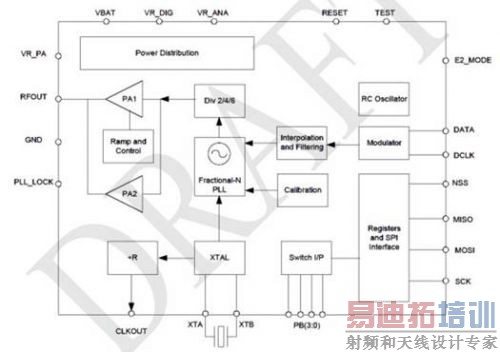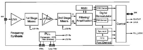 该器件支持FSK数据速率为1.56~200kbps,OOK数据速率高达32kbps。25kbps时FSK调制的接收器灵敏度为 -107dBm;2kbps时OOK接收器灵敏度为-113dBm。此外,该芯片符合欧洲(ETSI EN 300-220 V2.1.1)和南美(FCC Part 15.247和15.249)规范标准。所有主要的RF通信参数是可编程的,其中大部分可以动态设置。