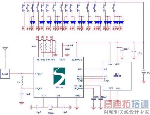 PB(3:0)是按键接口,如果使用二极管编码电路,最多可以支持15个按键。平时SX1230处于睡眠状态,按键动作将唤醒芯片并进行去抖,然后发送该按键对应的RF数据包,完成后再回到睡眠状态。