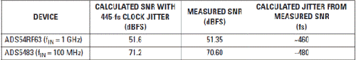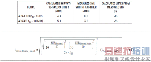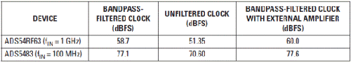 通过在时钟输入通路中安装低噪声 RF 放大器,两个数据转换器重复进行了高输入频率的 SNR 测量,其结果如表 5 所示。我们可以看到,测得 SNR 和预计 SNR 匹配的非常好。使用下面的方程式 5,计算得到的时钟抖动值在 90-fs 时钟抖动的 5 fs 以内,其结果通过相位噪声测得推导得出。 表590-fs 时钟抖动和RF 放大器的SNR 结果