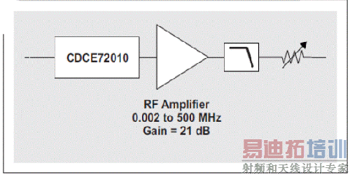 改善转换速率的一种方法是:在 CDCE72010 的 LVCMOS 输出和带通滤波器之间添加一个具有相当量增益的低噪声 RF 放大器,参见图 14。该放大器应该放置于滤波器前面,这样便可以将其对时钟信号的噪声影响程度限定在滤波器带宽,而非 ADC 的时钟输入带宽。由于下一个试验的放大器具有 21 dB 的增益,因此我们在带通滤波器后面增加了一个可变衰减器,旨在匹配滤波后 LVCMOS 信号到时钟生成器滤波后输出的转换速率。该衰减器可防止 ADC 的时钟输入超出最大额定值。 图14带通滤波器前面添加RF 放大器来降低转换速率
