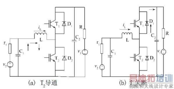 开关T2处于恒脉宽调制方式下,双向DC-DC变换器主电路Boost 模式下等效电路如图4 所示。当T2 导通时(图4(a)),电源v2向电感L充电,电能转化为磁能存储于L中,同时电容C2向v1供电;当T2关断时(图4(b)),电感L释放磁能向v1 供电。电感L的储能作用能使电压泵升,通过电容C2 稳压之后,可使输出电压高于输入电压。