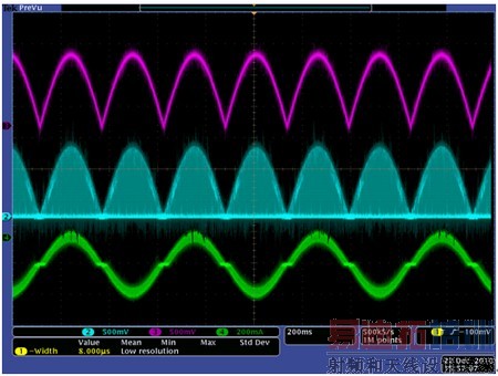 其中,粉红色波形是DAC产生的正弦波,绿色波形是经过放大器后的电压波形,蓝色波形是电机的电流波形。