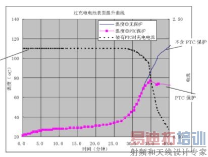 从上面的试验结果能够观察到,不带PTC 保护的电池在过充电时表面温度最高可达到接近120℃,最终引起漏液、起火甚至爆炸;而装有科特公司KT16-1750DL 型高分子PTC 的电池其表面温度不会超过80℃。