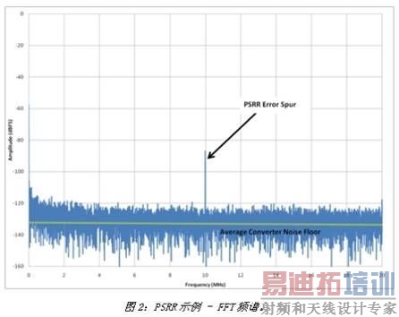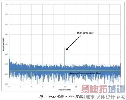对于转换器和最终的系统而言,必须确保任意给定输入上的噪声不会影响性能。前面已经介绍了PSRR、PSMR及其重要意义,下面将通过一个示例说明如何应用所测得的数值。该示例将有助于设计人员明白,为了了解电源噪声并满足系统设计需求,应当注意哪些方面以及如何正确设计。
