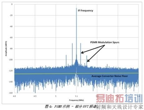 另一个区别是仅在低频施加调制或误差信号,目的是观察此信号与施加于转换器的模拟输入频率的混频效应。对于这种测试,通常使用1-100kHz频率。只要能在基频周围看到误差信号即混频结果,则说明误差信号的幅度可以保持相对恒定。但也不妨改变所施加的调制误差信号幅度,以便进行检查,确保此值恒定。为了获得最终结果,最高(最差)调制杂散相对于基频的幅度之差将决定PSMR规格。图4所示为实测PSMR FFT频谱的示例。