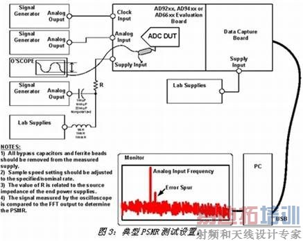 PSMR的测量方式基本上与PSRR相同。不过在测量PSMR时,需将一个模拟输入频率施加于测试设置,如图3所示。