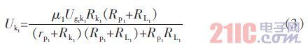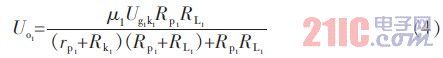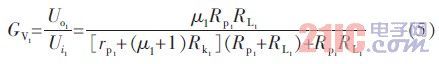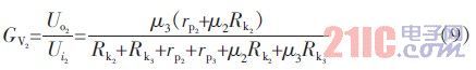 将式(6)~(8)联立,经过简化可得出输出级的电压增益为: