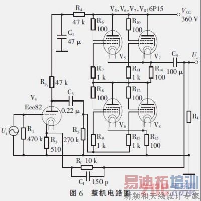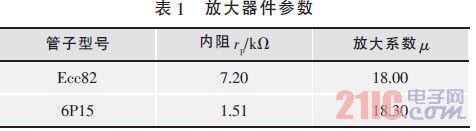 输入级放大器件选用Ecc82双三极管,输出级选用6P15,基本参数如表1所示。为降低输出阻抗,以便于和阻抗较低的耳机相匹配,输出级SRPP电路采用双管并联的方式工作。放大器的相关参数计算方法如下所示,其中开环电压增益为: