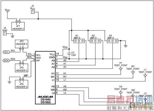 图2给出了估DS1845/DS1855时的特定连接方式。跳线器用来选择地址总线,隔离开所使用的电源VCC (VDD)以及SDA和SCL。