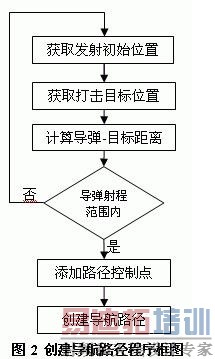 路径导航在战场对抗仿真中有着大量的应用,对战前期的战斗部队、坦克编队等的行进通常是沿着固定或者相对固定的路线进行进的,对战过程中的以制导导弹为代表的火炮武器炮弹在发射后也都会按照一定的路径进行导航的。导航路径的生成有两种方式,一种是非实时的,即使用路径工具(PathTool)预先定义,另一种则是实时的生成导航路径。以导弹飞行路径生成为例,由于直升机运动的不确定性,在发射导弹的位置和时间是随机的,不可能事先预知导弹的运动轨迹,所以必须在仿真应用程序中实时的生成导航路径,图2 是生成导航飞行路径的程序流程图: