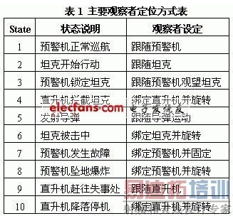 视点是仿真系统用户观察虚拟场景的唯一接口,包含了对视点进行抽象的观察者(Vega Observer)是用户在虚拟场景中的替身,观察者的位置和姿态决定了整个虚拟战场环境可以提供给用户的信息。一方面要纵观作战战场全局给用户特别是指战员提供一个视野宽广的虚拟环境,另一方面又要考虑能够以与动态仿真实体相一致的视角来观察虚拟作战环境,从而获得更好的沉浸感。一般而言,虚拟战场环境范围较大、仿真实体数量多且运动状态复杂多变,所以视点应该能够尽可能的进行多角度、多模式观察,可以采用多观察者方案,即一个主要观察者和若干个辅助观察者。我们在应用程序中使用了Vega基本模块提供的形式多样的观察者定位方式,包括跟随、绑定、旋转、固定路径、观望等多种模式及其混合模式,使用者可以通过弹出菜单或快捷键在多个观察者之间进行实时切换和组合,以满足使用者的不同需求。表1中给出了不同状态下主要观察者的定位方式: