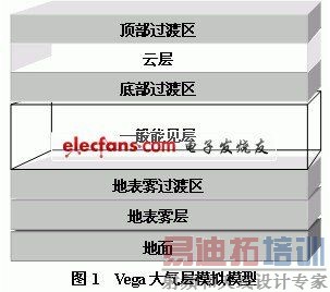自然环境对战场态势发展和对战双方的作战指挥等有着重要的影响,虚拟战场场景中的自然环境表达直接关系到仿真应用的真实性和可信度。为了能够逼真的模拟出自然界中的大气层环境,Vega 使用了如图1所示的七层结构的大气层模拟模型,同时还提供了多种可由参数控制的自然环境效果,我们可以直接在相应的LynX面板中对包括天空颜色、雾模型、云彩模型、环境光等在内的多种元素进行预设,在应用程序执行的过程中还可以通过调用相应的API函数[6]对自然环境的各种参数进行交互式设置,实时改变虚拟战场的自然环境效果,从而达到检验不同自然条件下作战效能之目的。