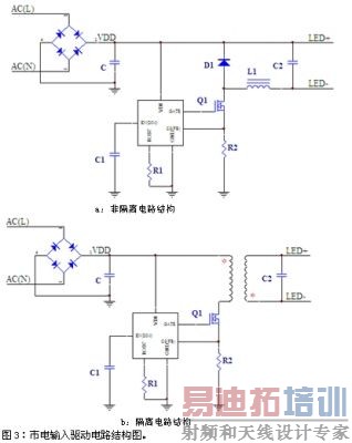 隔离和非隔离驱动方式主要针对市电交流输入而言。当采用图3a的非隔离方式时,建议工作在电流连续模式;当采用图3b的隔离方式时,建议变压器工作在非连续方式(即每个周期结束时,变压器无剩磁),这样可以保证每次开关周期,变压器原边传送给副边的能量相同(与电源电压无关)。