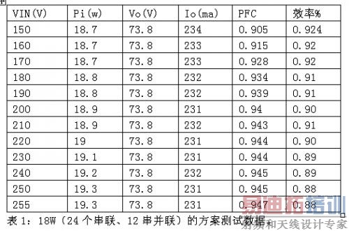 在AX2028_TUBE_18W非隔离应用设计(图4)中,LED光源阵列设计为0.06W白光LED(SMT或草帽灯)24个串联、12串并联的方案,驱动288个小功率WLED,总功率为18W。