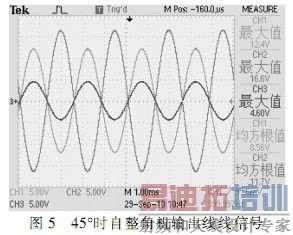 根据图中所示,在确定的角度下,自整角机三路线线信号在电压上呈120°正弦关系,接口电路转换输出信号为两路电压正交信号,根据角度不同,两路信号电压峰值不同,单路最大时电压为2Vrms。测试结果完全符合设计要求。