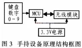 在设计时,首先根据需要输出的固定电压、最大工作电流确定相应的电源器件。再根据电源器件确定电源电路和外围元件。手持设备采用低功耗型单片机(MCU)MSP430F123A作为主控制器,扫描由0~9数字组成的键盘响应,然后通过LSD-RF1100-A433无线模块实现数据的无线传输,该手持设备的原理结构框图如图3所示。