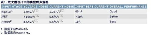 没有一种放大器能够适合所有应用。表1总结了三种常见放大器设计的典型噪声参数。