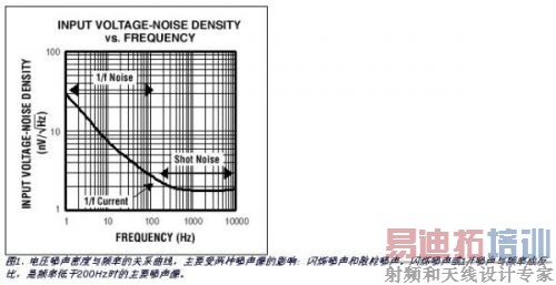 图1所示为电压噪声密度与频率的对应关系曲线。噪声曲线与两个主要的噪声成份有关:闪烁噪声和散粒噪声。闪烁噪声是所有线性器件固有的随机噪声,也称作1/f 噪声,因为噪声振幅与频率成反比。闪烁噪声通常是频率低于200Hz时的主要噪声源,如图1所示。1/f角频率是指噪声大小基本相同、不受频率变化影响的起始频率。散粒噪声是流过正向偏置pn结的电流波动所造成的白噪声,也出现在该频段。值得注意的是:电压噪声的1/f角频率与电流噪声的1/f角频率可能会不同。
