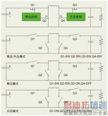 第二款新型降压/升压控制方式在每个开关周期只运行2个MOSFET,从而降低了损耗。从图2可以看出,这种控制方案可以运行于三种不同模式。当Vin大于Vout时,转换器打开Q4并关闭Q3,然后将Q1及Q2作为标准降压转换器使用;当Vin小于Vout时,控制电路打开Q2并关闭Q1,然后将Q3及Q4作为标准升压转换器使用。但这种控制模式在降压与升压模式间的转换区会出现一些运行和控制问题。为解决这些问题,可在转换过程采用标准降压/升压模式。因为在标准降压/升压工作模式下,所有4个开关均处于工作状态,所以能够解决这些控制问题。但开关损耗与RMS电流的提高使得转换区中的效率骤降,而且这个效率骤降区接近电池电压(大部分电池电量在此时提供),所以在电池放电曲线的大部分区域中,转换器工作于低效的降压/升压模式下。