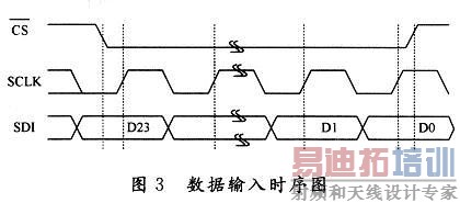 当LDAC输入为低电平,片选信号CS为低电平时,每一位输入数据在串行时钟SCLK的上升沿时写入SPI串口移位寄存器,如图3所示。