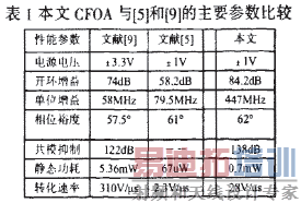 本文的低压低功耗 CFOA,它在只需1V 电源电压情况下,仅产生0.7mW 功耗,84.2dB 的开环增益,62°的相位裕度,高达138dB 的共模抑制比, -0.85V~0.97V 的输出电压范围。 由于电源电压只有1V,使得功耗较小,这对便携式设备和需要较小电压的场合的利用极为 有利。本文作者创新点:利用MOS 管实现串联电阻以消除补偿电容带来的低频零点,通过高 输出阻抗镜像电流镜增大了电路的增益,并用共源共栅电流源为电路提供偏置电流以减小电 源电压的变化对偏置电流影响。本文的参数以及与文献的比较如下表中所示。