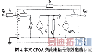 本文所设计的 CFOA 电路的交流小信号等效电路如图4。第一级是输入级,采用CCⅡ-。 第二级采用传统的两级运算放大器。