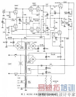 图2是6C33 C-B双三极管OTL功放电路图。本电路采用国外新型低内阻、大功率双三极管6C33C-B作OTL功放,每个声道用一对6C33C-B作功率放大,在输出8Ω负载时,每声道的输出功率可达40W。
