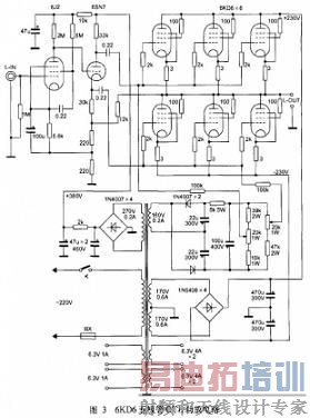 图3是6KD6五极管OTL功放电路图。它是将普通束射四极管或五极功率电子管改为三极管接法的OTL功放,利用了电子管帘栅极在相同栅压下可以输出较大电流的特点。原来由于相对的屏极内阻较大,限制了工作电流,但改成三极管接法以后,帘栅极的电压与屏极电压处于同等电位,屏极内阻大幅度下降,加强了屏极承受较大电流的能力,因此能在低阻抗负载下输出较大功率。