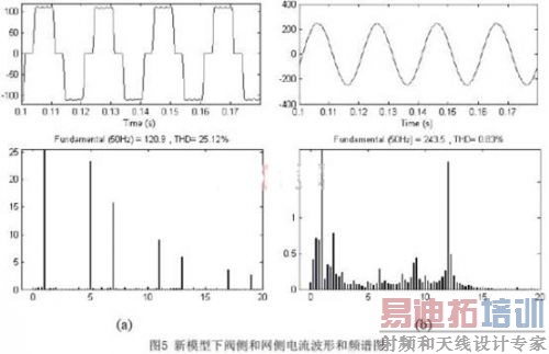 本文基于Matlab动态仿真工具Simulink下的电力系统工具箱Simpowersystem对图2系统进行仿真工作。仿真所用到的该实验平台交直流系统参数及新型换流变压器、传统换流变压 器参数因篇幅限制略.由图5(a)和图5(b)明显可知,新型换流变压器及其滤波系统可有效地将 主要次特征谐波抑制于阀侧,网侧绕组电流的畸变率大大降低。对比阀侧和网侧的电流频 谱图,新系统下的阀侧滤波方案可将换流器产生的5、7、11 和13次主要次特征谐波有效地 抑制于阀侧,且变压器原边出线端的谐波含量远低于国家标准,进一步说明该文基于感应滤 波机理的滤波器的优越性和可行性。