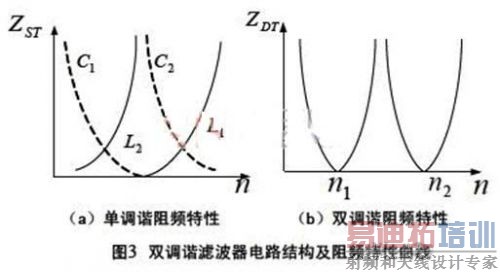 串联和并联回路的阻抗特性曲线的交点 ω1 、 ω2 处,容 抗与感抗相互抵消,它们对应的谐波次数为 n1 、 n2 。 双调谐滤波器的阻频特性需要将串联回路与并联回路的阻频特性合成考虑.此时,双调 谐滤波器的阻频特性曲线如图3(b)所示,明显可知其在谐波次数为 n1 、n 2处发生谐振.