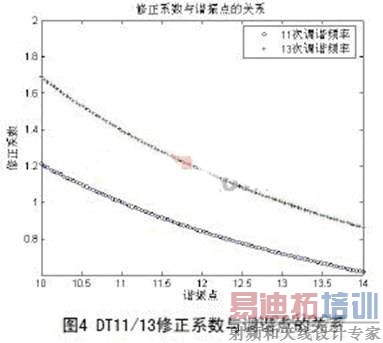 由图4 曲线可得到如下结论: (1)安全系数必须大于1,这样,才能使各调谐点稍微前移,避免与系统发生谐振,且使 DT11/13 在11、13 次调谐频率下呈感性,避免谐波放大。 (2)安全系数必须有个上限,这样,才能不致于使滤波器过分频偏,影响滤波效果及对 系统的无功补偿量。