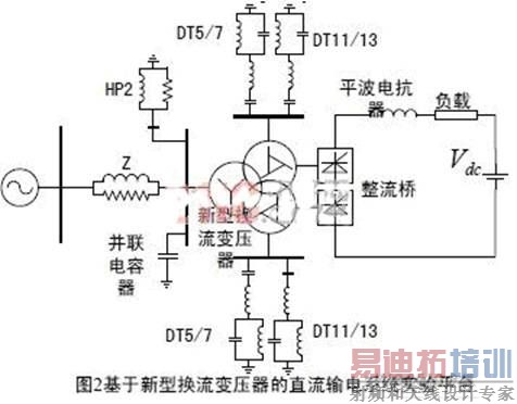 根据直流输电系统的特点,建立如图2 所示用来验证新型滤波方式及对比分析与传统无 源滤波效果差异的实验平台。整流站采用新型换流变压器,二次绕组有抽头引出接DT5/7 和DT11/13,一次绕组出线端,即网侧接二阶高通滤波器HP2 及并联电容器;逆变站采用 传统换流变压器,这里不再说明。 新型直流输电系统阀侧采用双调谐滤波器,其基本电路结构由图2可知;其有两个谐振 频率,同时吸收两个邻近频率的谐波,等效于两个并联的单调谐滤器[7]。
