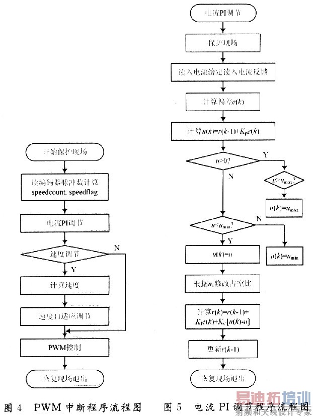 采用定时器周期中断标志启动A/D转换,当T1下溢时启动A/D转换,所检测的电流经处理后接模/数转换器的ADCIN00引脚,当转换完成后,中断标志位都被设置为1,则在A/D中断服务程序中将转换结果读出,完成1次A/D采样。转换结束后申请PWM中断,PWM中断完成主要的控制功能,流程图如图4所示。由于电机控制系统的机械时间常数远大于系统的电气时间常数,系统的速度环控制周期可比电流环控制周期大。该系统在每个PWM周期中都进行一次电流采样和PI调节,因此电流采样周期与PWM周期相同,可以实现实时控制,而速度环控制周期选为每100个PWM周期,对速度进行1次调节。在每个电流控制周期,被QEP单元计数的脉冲数被累加到变量speedcount中,变量speedflag从初始值speedstep(100)开始减1直到等于0,此时读取100个电流控制周期(1个速度控制周期)的总脉冲数进行速度计算,并将speedcount清零,将变量speedflag赋初始值,开始下一次速度脉冲计数。