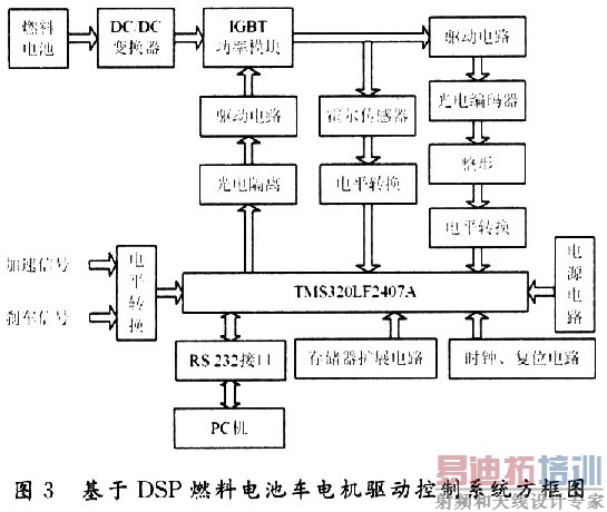 基于FMS320LF2407A的燃料电池车电机驱动控制系统硬件系统方框图如图3所示,主要包括给定信号检测电路、电流检测电路、速度检测电路、PWM输出电路和DSP外部电路。