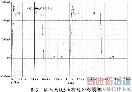 图2中的Cl为补偿电容,用于消除电路所产生的过冲。R7和R8为限流电阻,可用于保护三极管,R4为实际电路中假设的负载。设输入电压为上升下降时间均为20 ns的脉冲,因此,可对图2电路进行仿真。