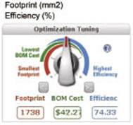 "优化调谐"拨盘(图 3)的指针可向"最低 BOM 成本"或"最高效率"方向转动。这将在图形和表格(图 2)中添加更多的设计解决方案。黄色圆对应着表格中高亮标注的设计和实际显示出的框图。参考其它圆与优化拨盘刻度的背景色色差,可以了解到相关的优化策略。